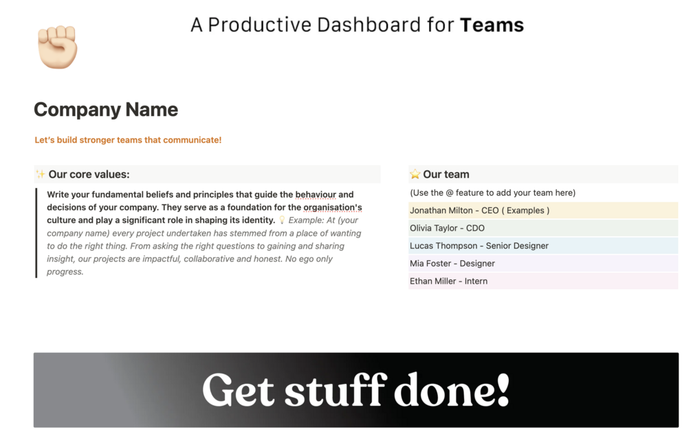 This template was created with small, collaborative teams in mind—teams that value productivity, clear communication, and staying aligned on what truly matters. It’s designed to help you track daily tasks, manage client interactions, collect feedback, and stay connected to your team’s core values.